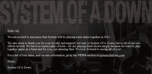 System of a Down ( SOAD ) anunciou no seu site oficial que deve voltar em 2011